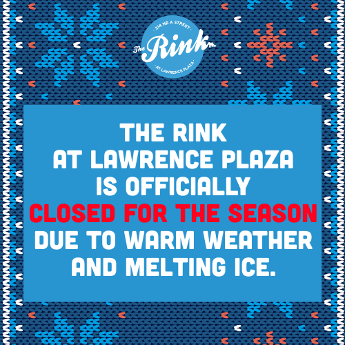 The Rink at Lawrence Plaza is closed for the season due to warm weather and melting ice conditions.